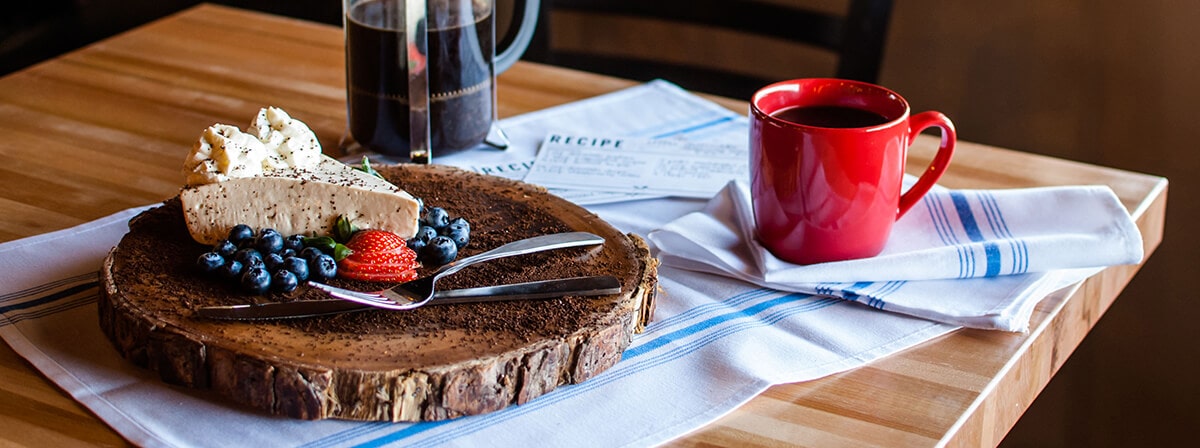 The pie crust couldn’t be simpler. Just mix together three ingredients and press them into the pan. You can choose the chocolate or traditional graham cracker version. The creamy filling shines with subtle coffee notes – both from brewed coffee mixed in with the cheese and from coffee ‘n’ chocolate swirled on top. Also, there’s no last-minute frosting, garnishing or fussing. Make this several days before serving so dessert is completely stress-free.