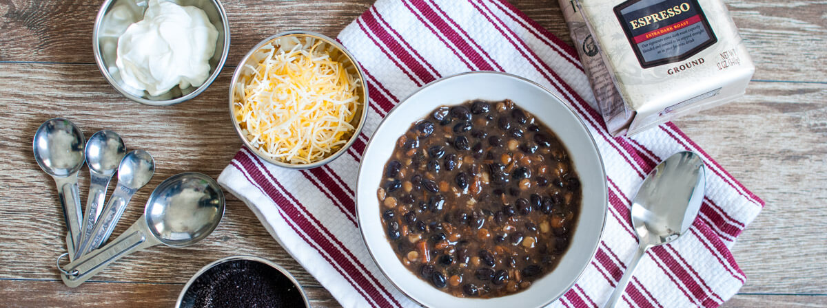 This hearty soup is designed to be a satiating meatless meal option with layers of flavor developed from sweet, smoky and hot peppers, cumin, chili powder, tomatoes, broth and coffee. You won’t necessarily taste the brewed coffee, but its roasted, earthy notes heighten and complement the other flavors. (Check out “Don’t Just Sip … Eat Your Coffee!” for more on cooking and baking with coffee.)